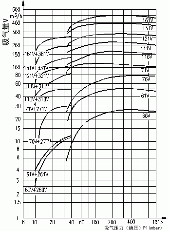 ?、郾纠袨?1V 注:該性能曲線是在吸入介質(zhì)為20℃的飽和空氣,工作液溫度15℃,排氣壓力1013mba的狀態(tài)下得到的。性能允許差±10%,下圖為配用大氣噴射器的性能曲線。